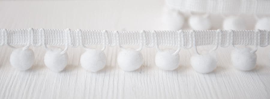Beautiful quality, chenille finish, pompom fringe in a great range of colours at a great price. The pompom itself is 18mm diameter, overall depth is 30mm. Perfect for furnishing uses: cushion covers, throws, lampshades etc also used on garments, fancy dress etc.